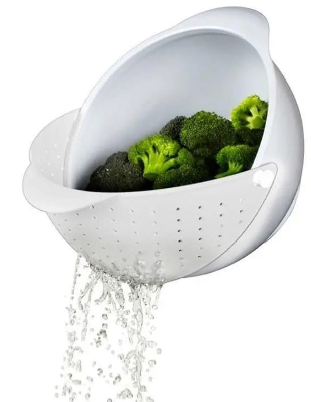 Miskę z sitkiem po umyciu warzyw czy owoców wystarczy przechylić, aby odlać wodę.