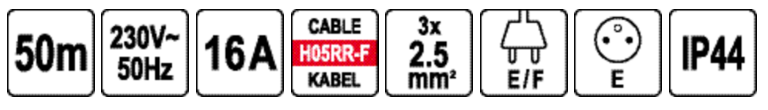 - maksymalne obciążenie: 1200 W – przewód zwinięty, 3600 W – przewód rozwinięty.